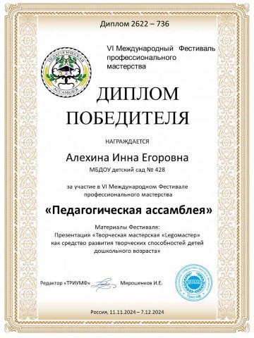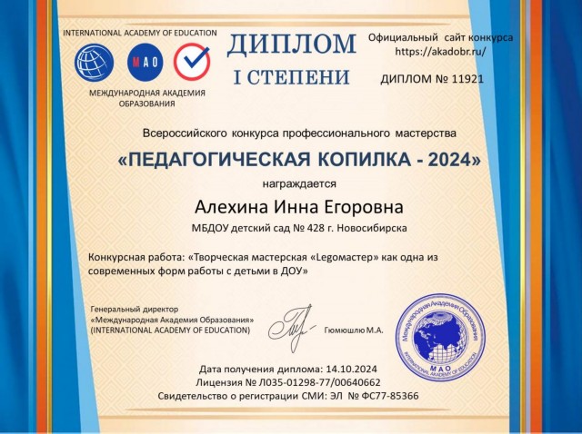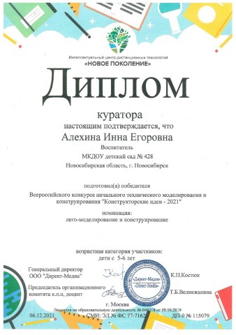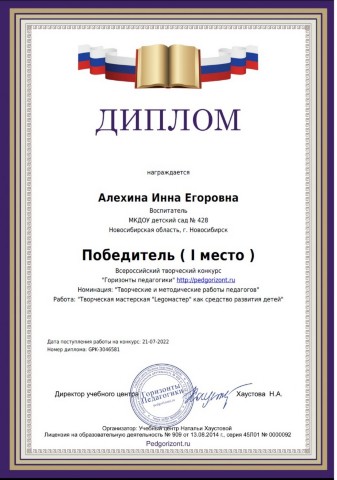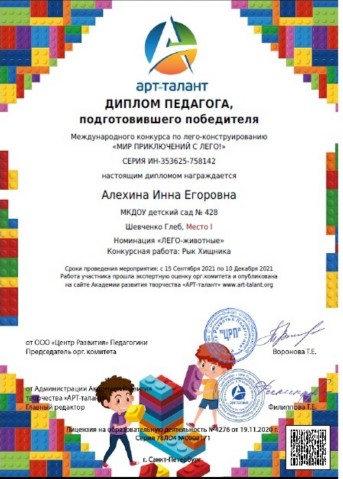 Диплом за подготовку победителя в международном конкурсе по Лего-конструированию "Мир приключений с Лего" |