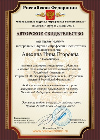Авторское свидетельство Федеральный журнал "Профессия Воспитатель" |
