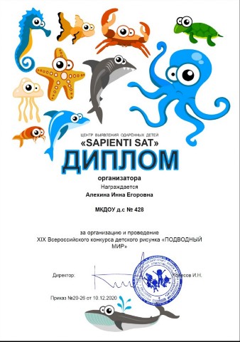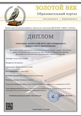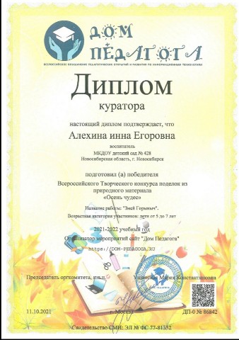 Диплом за подготовку победителя во всероссийском творческом конкурсе "Золотая осень красотой пленила!" |