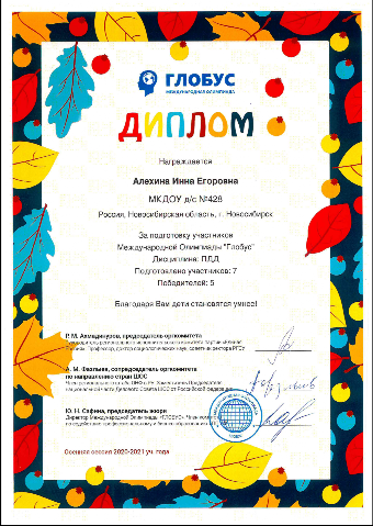 Диплом за подготовку участников международной олимпиады «Глобус» по ПДД |