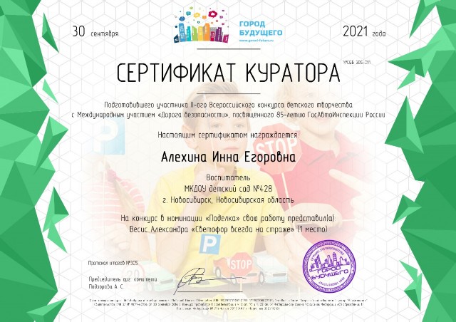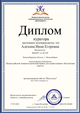 Диплом куратора подготовившего победителя всероссийской занимательной викторины "Безопасная дорога" |