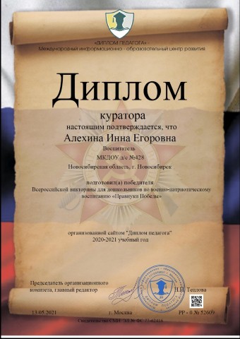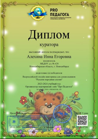 Диплом куратора подготовившего победителя всероссийской детской викторины "Русские народные сказки" |