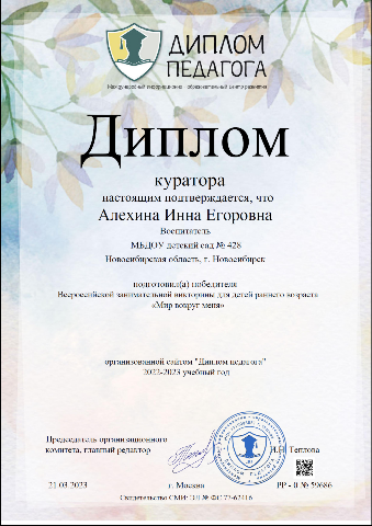 Диплом куратора подготовившего победителя всероссийской викторины"Мир вокруг меня" |