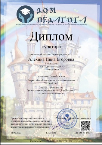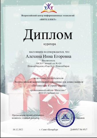 Диплом куратора подготовившего победителя всероссийской детской викторины "Путешествие в страну сказок" |