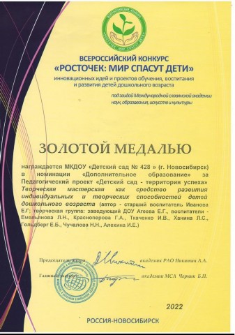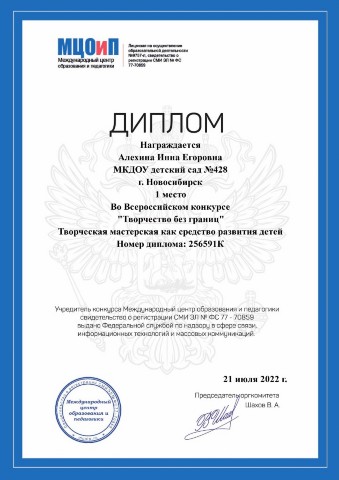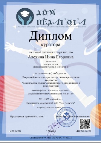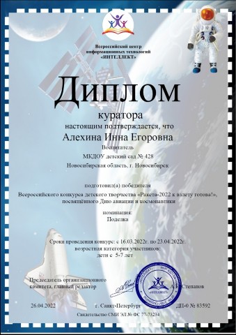 Диплом за подготовку победителя во всероссийском творческом конкурсе "Ракета - 2022 к взлету готова!" |
