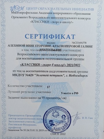 Сертификат за участие во Всероссийском интеллектуальном конкурсе Классики "Скоро в школу"