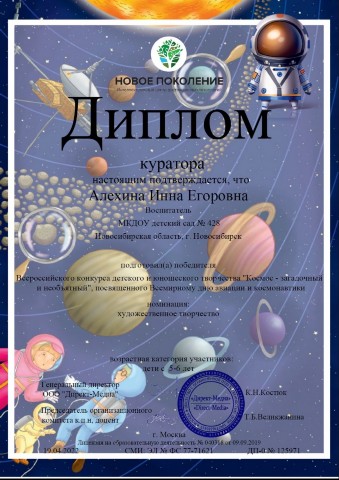 Диплом за подготовку победителя во всероссийском конкурсе "Космос загадочный и необъятный" |