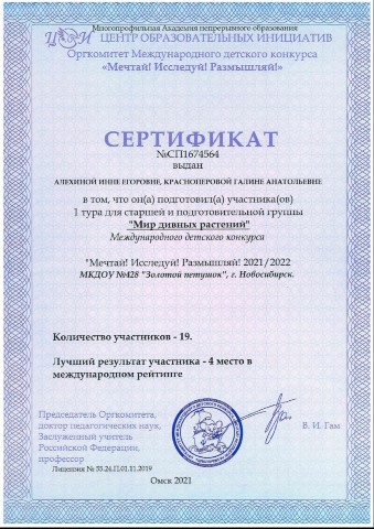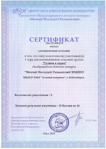 Сертификат за участие в Международном конкурсе "Мечтай! Исследуй! Размышляй!" Гуляем в парке |