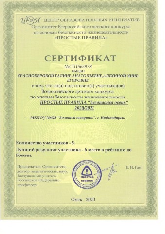 Сертификат куратора подготовившего участников всероссийского детского конкурса "Простые правила" по основам безопасности жизнедеятельности |