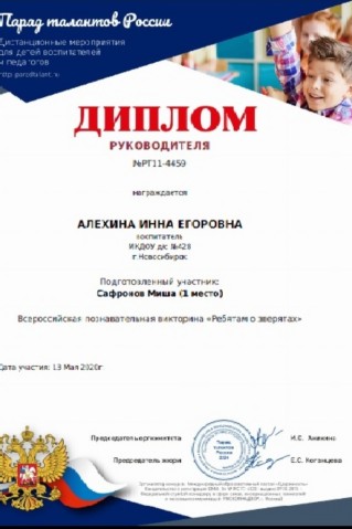 Диплом руководителя за подготовку победителя всероссийской познавательной викторины "Ребятам о зверятах" |