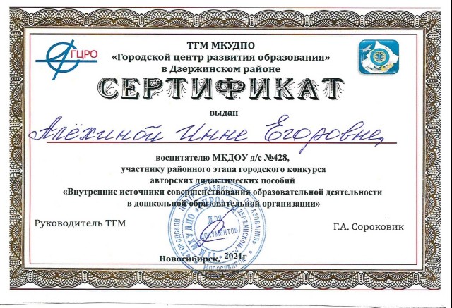 Сертификат участника районного этапа городского конкурса авторских дидактических пособий |