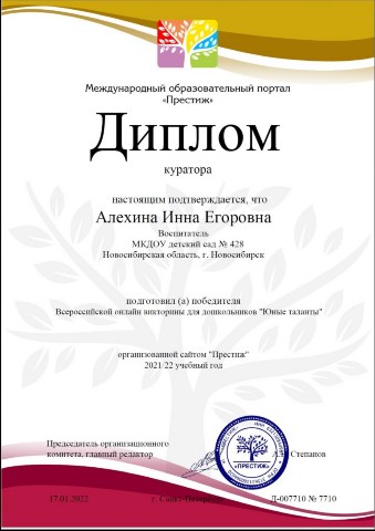 Диплом куратора подготовившего победителя всероссийской олимпиады"Отгадай-ка" |
