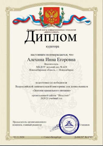 Диплом за подготовку победителя Всероссийской занимательной викторины "Знатоки правильного питания" |